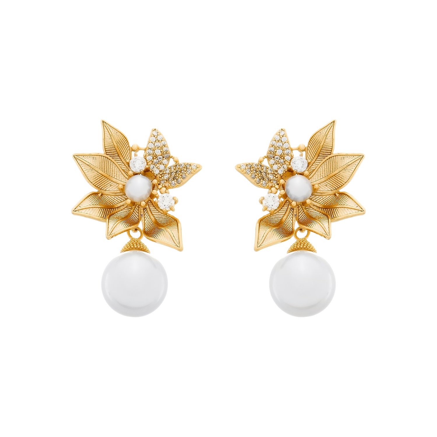 Brinco Dourado com Folhas em Zircônia e Pérolas